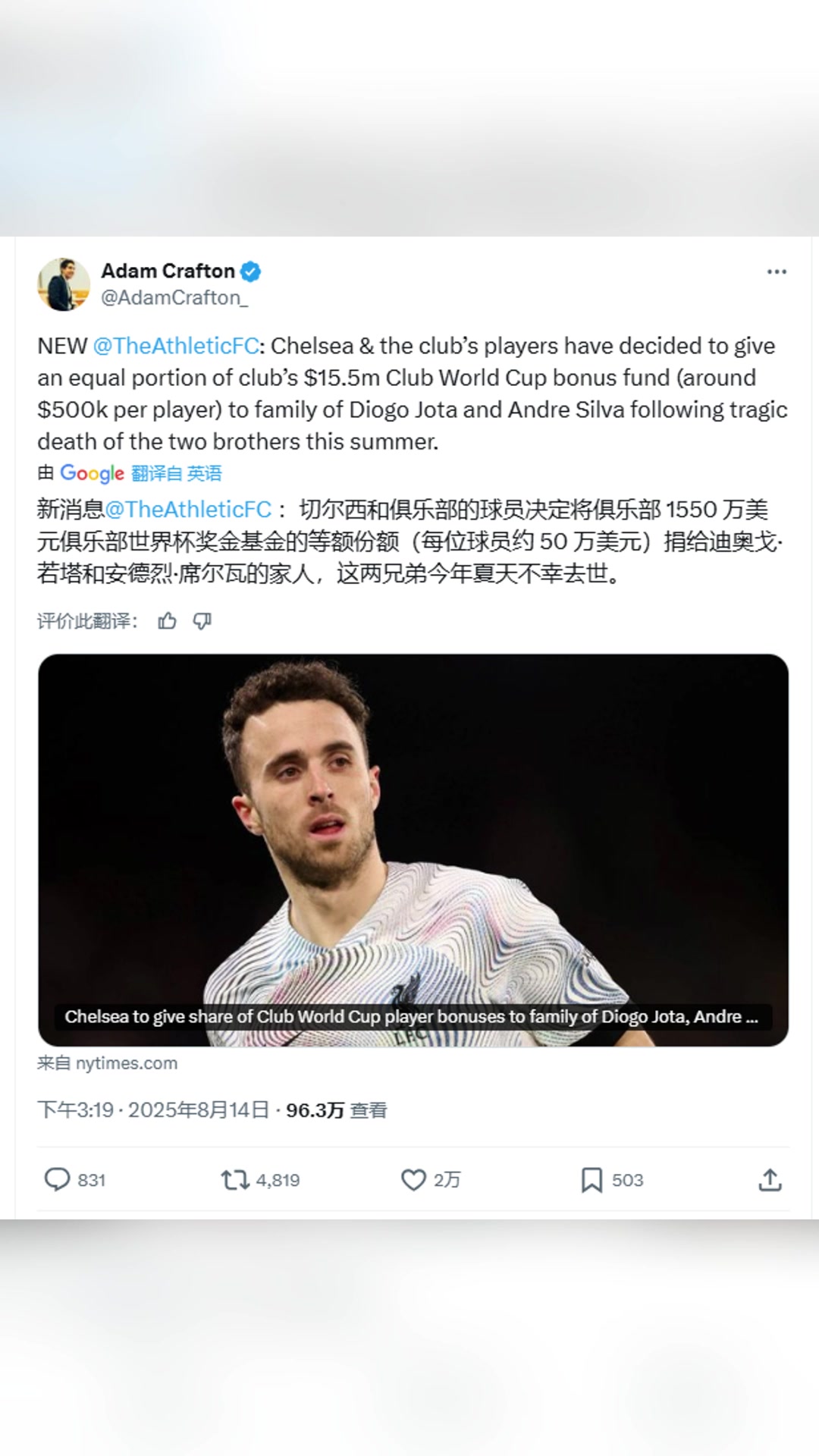 TA切尔西与球员将部分世俱杯奖金捐给若塔家人数额超50万美元