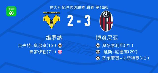 北京时间1月16日意大利足球顶级联赛 联赛 第16轮,维罗纳主场对阵博洛尼亚。维罗纳吉夫特-奥尔班破门。博洛尼亚奥尔索利尼破门, 延斯-厄德高破门,圣地亚哥-卡斯特罗破门,弗罗伊勒自摆乌龙。最终比分维罗纳 2-3 博洛尼亚。