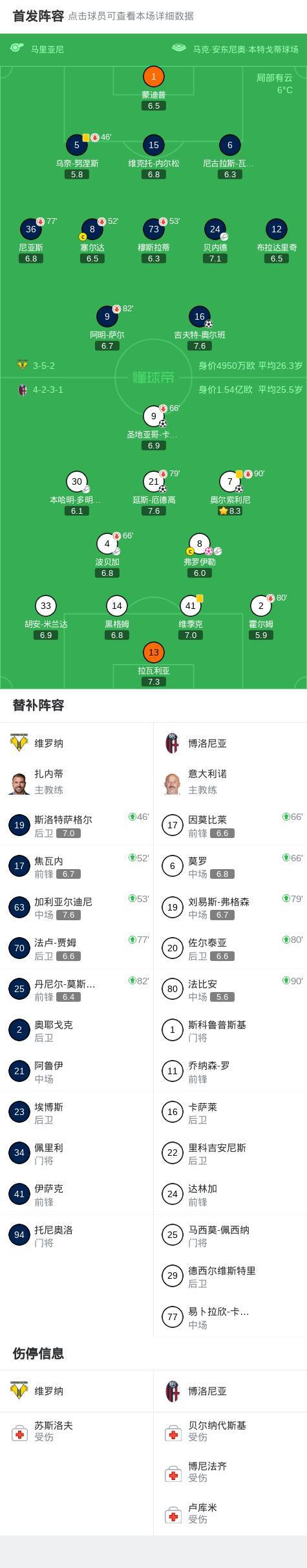 第43分钟,博洛尼亚球员波贝加助攻圣地亚哥-卡斯特罗打入一球。