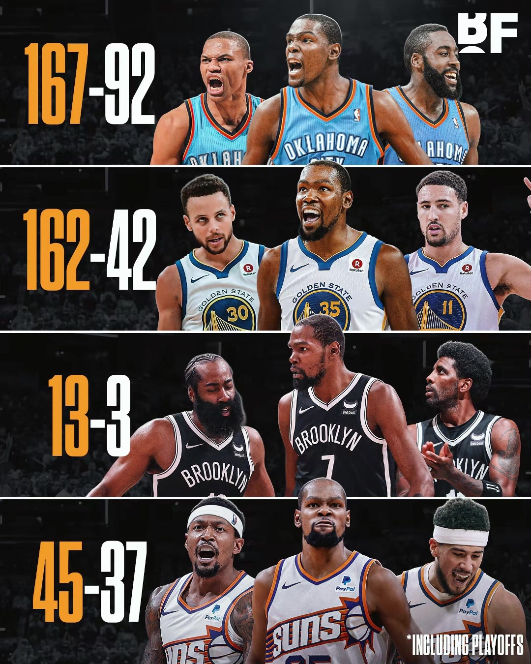 KD在各三巨头时期的胜负勇士时期最强篮网时期令人惋惜