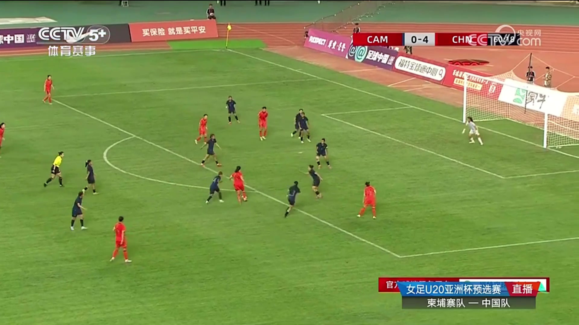 中国女足边路传中柬埔寨门将扑出后郑璐补射破门