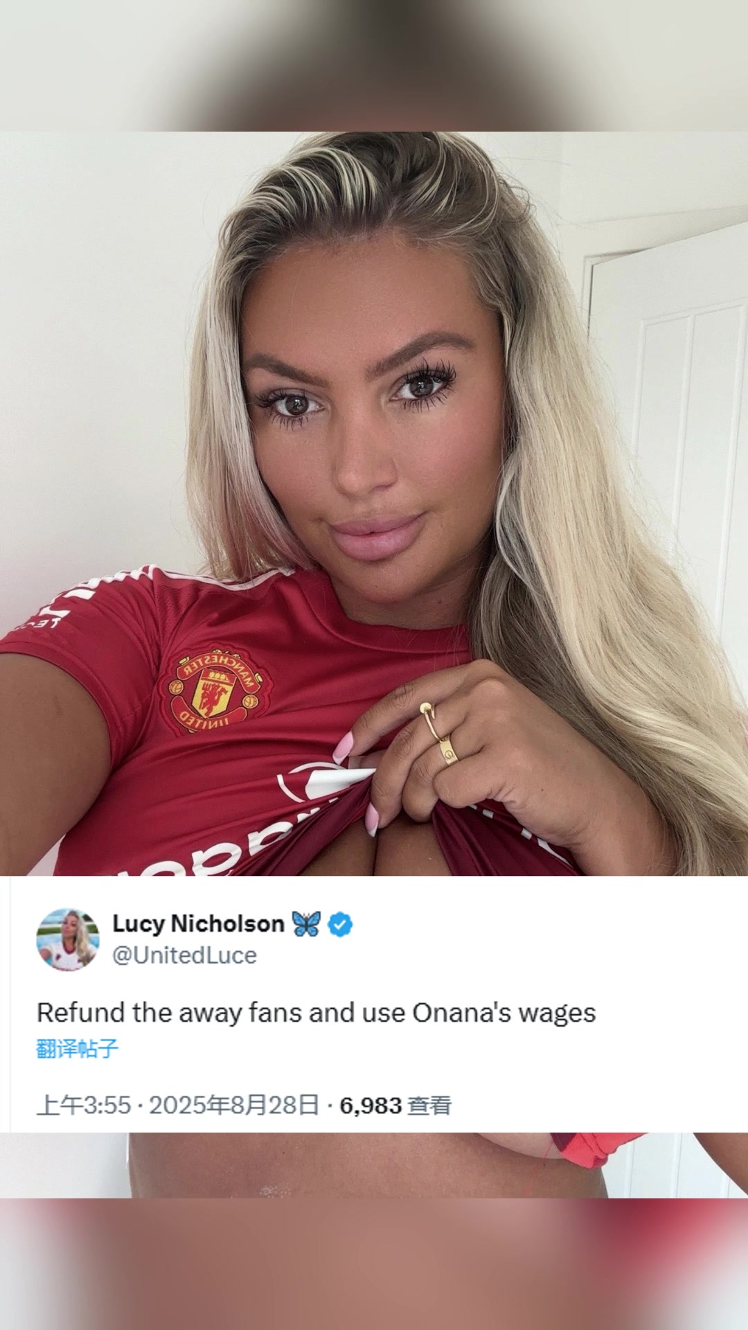 怒了曼联成人女星球迷用奥纳纳的工资给客场球迷赔偿