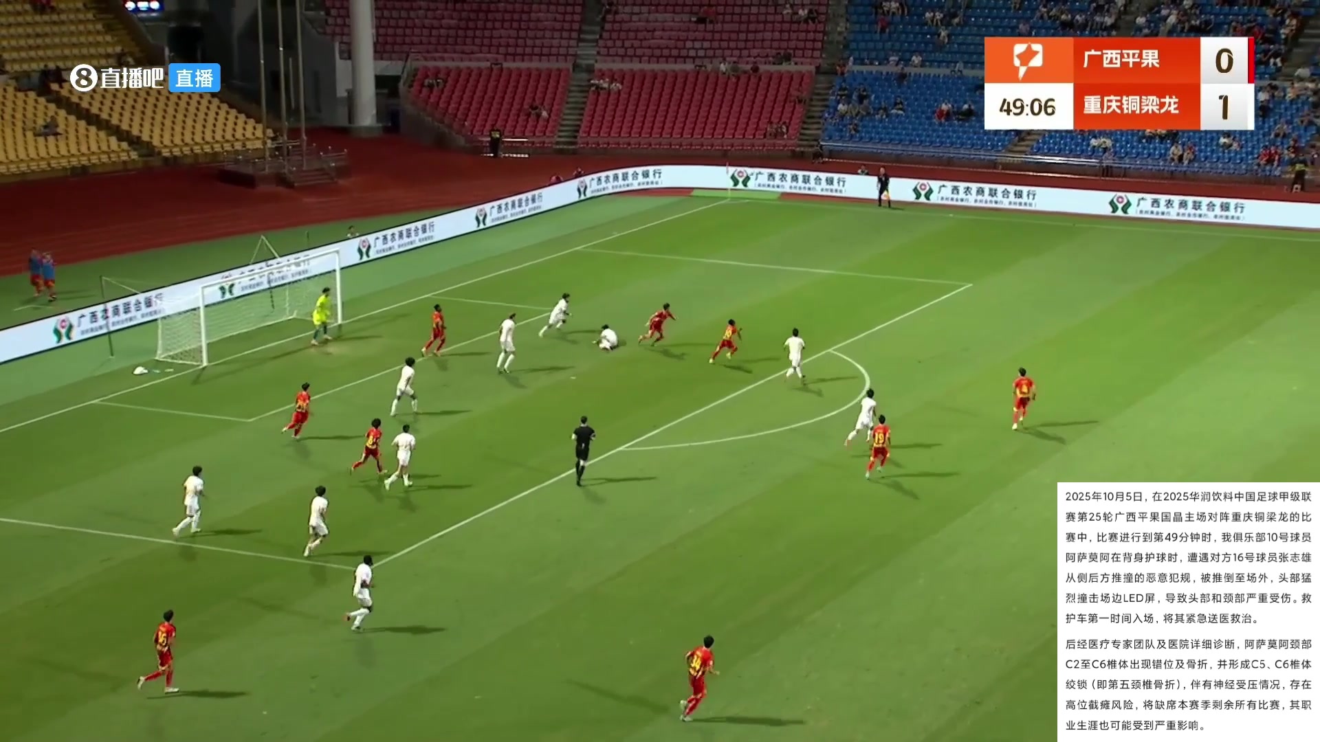 送医后查出存在截瘫风险中甲外援遭铜梁龙球员犯规撞到LED屏