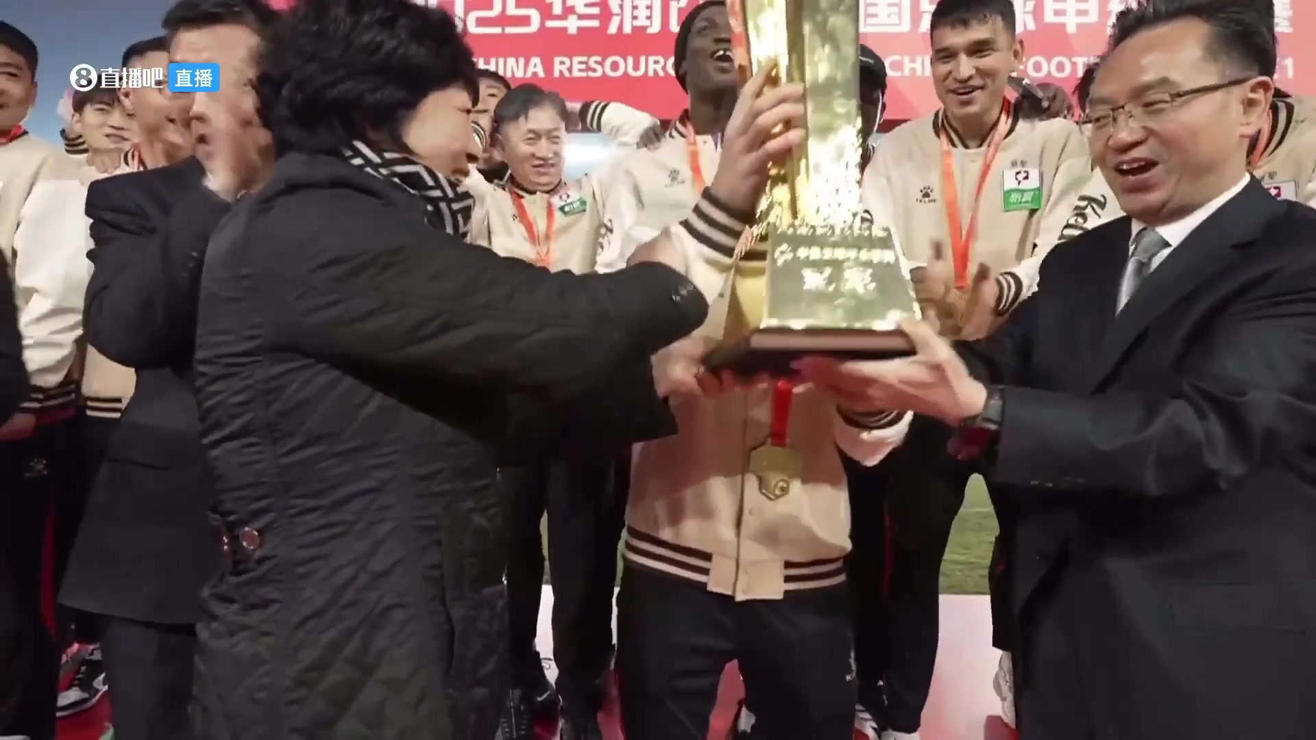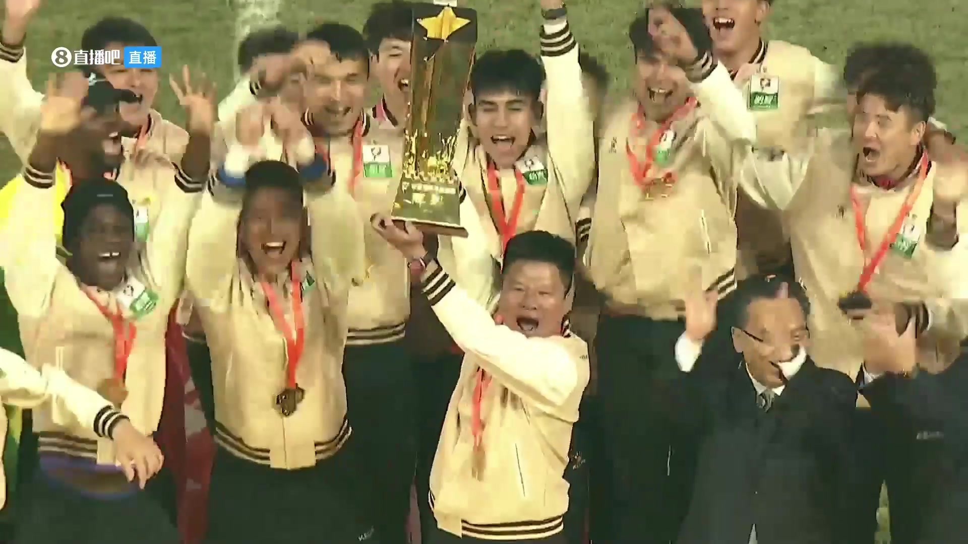 捧杯时刻辽宁铁人众将举起中甲冠军金杯庆祝夺冠冲超